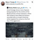 اعادت ماري ترامب، ابنة شقيق الرئيس الأميركي دونالد ترامب، نشر صورة مقبرة جماعية تُحفر لدفن 168 تلميذة إيرانية قتلن في قصف مدرسة ميناب، معلقة "أتحدى أي شخص أن يبرر هذا" وذلك بعد أن تم قصف المدرسة بغارة أميركية إسرائيلية.