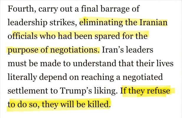 أشار المتحدّث باسم وزارة الخارجية الإيرانيّة إسماعيل بقائي، تعليقًا على مقال نُشر في إحدى الوسائل الإعلاميّة الأميركيّة المتشدّدة، هدّد المفاوضين الإيرانيّين بالاغتيال، إلى أنّ "في الوقت الّذي يتّهم فيه المسؤولون الأميركيّون إيران بافتقارها إلى "حسن النّيّة" وممارسة "الابتزاز"، نجد أنّ بعض التيّارات في دوائر صنع القرار والإعلام الأميركي توصي علانيّةً باغتيال المفاوضين الإيرانيّين في حال فشل المفاوضات".