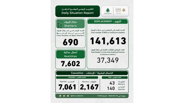وأشارت إلى أنّ "إجمالي عدد النّازحين المسجّلين في مراكز الإيواء وصل إلى 141,613 نازحًا، فيما ارتفع العدد الإجمالي للعائلات النّازحة في مراكز الإيواء إلى 37,349. كما بلغ العدد التراكمي للشّهداء 2167 والجرحى 7061 (منهم 43 شهيدًا و140 جريحًا اليوم)، في حين وصل عدد الأعمال العدائيّة إلى 7602".