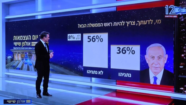 أظهر استطلاع لصالح القناة 12 الإسرائيلية أن 56% من الإسرائيليين لا يريدون أن يكون بنيامين نتنياهو رئيسًا للحكومة الإسرائيلية المقبلة، في حين 36% من الإسرائيليين يريدون ذلك.
