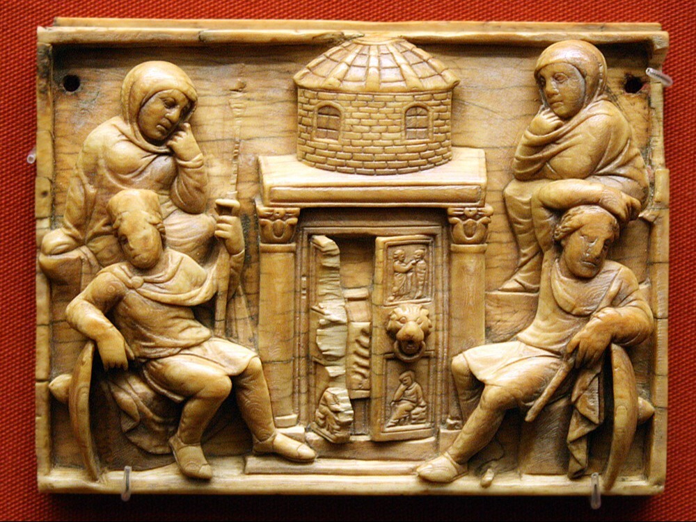 يعبِّر الفنُّ الإيقونغرافيُّ عن حدث القيامة المجيد من خلال تصويرين أساسيَّين: الأوَّل ما يعرف بمشهد القبر الفارغ ومجيء حاملات الطيب باكرًا جدًّا يوم الأحد إلى القبر، حيث كان جسد الربِّ يسوع المسيح الطاهر مضطجعًا ووجدن القبر فارغًا، وحيث ظهور الربِّ لهنَّ. هذا التصوير هو الأقدم في الكنيسة وموجود منذ بدايات القرن الخامس الميلاديِّ[1] على لوحات عاجيَّة ونقوش وفسيفساء (في رافينا) ورسومات (إنجيل رابولا السريانيّ 586م)، بالإضافة إلى أيقونة شهيرة من القرن السابع الميلاديِّ، موجودة في دير القدِّيسة كاترينا في سيناء. المشهد الأوَّل هو بمثابة اكتشاف للقيامة كما تذكر الأناجيل الأربعة مع تنوُّع في التفاصيل.