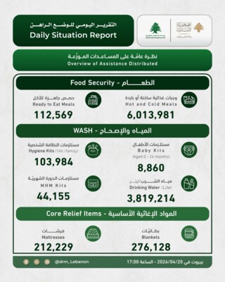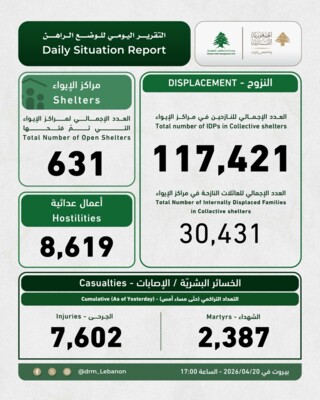 وأشارت إلى أنّ "إجمالي عدد النّازحين المسجّلين في مراكز الإيواء وصل إلى 117,421 نازحًا، فيما انخفض العدد الإجمالي للعائلات النّازحة في مراكز الإيواء إلى 30,431. كما بلغ العدد التراكمي للشّهداء حتى مساء أمس 2387 والجرحى 7602، في حين ارتفع عدد الأعمال العدائيّة إلى 8619".