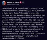 ولفت ترامب الى انه ستعمل الولايات المتحدة مع لبنان من أجل مساعدته على حماية نفسه من حزب الله. سيتم تمديد وقف إطلاق النار بين إسرائيل ولبنان لمدة ثلاثة أسابيع. أتطلع في المستقبل القريب إلى استضافة رئيس وزراء إسرائيل، بنيامين نتنياهو، ورئيس لبنان جوزاف عون، لقد كان شرفًا عظيمًا أن أكون مشاركًا في هذا الاجتماع التاريخي جدًا.