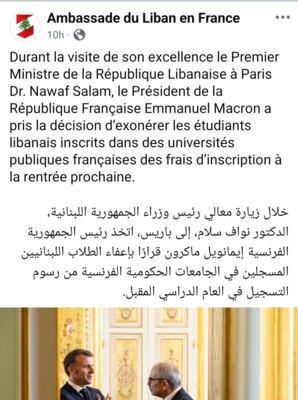 كشفت السفارة اللبنانية في باريس، في منشور عبر وسائل التواصل الاجتماعي، أن "خلال زيارة رئيس الوزراء ​نواف سلام​، إلى باريس، اتخذ الرئيس الفرنسي ​إيمانويل ماكرون​ قرارًا بإعفاء الطلاب اللبنانيين المسجلين في الجامعات الحكومية الفرنسية من رسوم التسجيل في العام الدراسي المقبل".