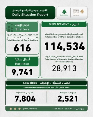 وأشارت إلى أنّ "إجمالي عدد النّازحين المسجّلين في مراكز الإيواء انخفض إلى 114,534 نازحًا، كما انخفض العدد الإجمالي للعائلات النّازحة في مراكز الإيواء إلى 28,913. كما بلغ العدد التراكمي للشّهداء حتى مساء أمس 2521 والجرحى 7804، في حين ارتفع عدد الأعمال العدائيّة إلى 9741".