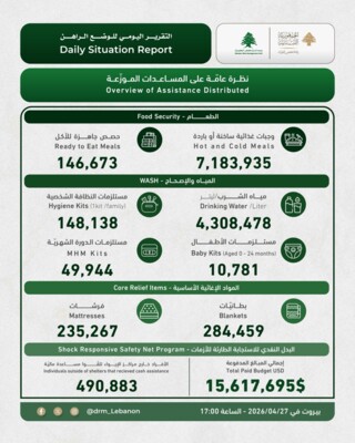 أعلنت وحدة إدارة مخاطر الكوارث في رئاسة مجلس الوزراء، في تقريرها اليومي للوضع الرّاهن بسبب توسّع العدوان الإسرائيلي على ​​لبنان​​، حتى السّاعة الخامسة من بعد الظّهر، أنّ "العدد الإجمالي لمراكز الإيواء الّتي تمّ فتحها هو 616 مركزًا في مختلف المناطق اللّبنانية".