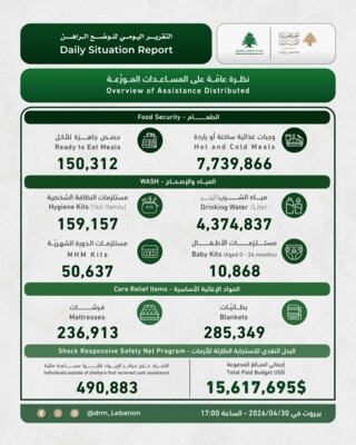 أعلنت وحدة إدارة مخاطر الكوارث في رئاسة مجلس الوزراء، في تقريرها اليومي للوضع الرّاهن بسبب توسّع العدوان الإسرائيلي على لبنان، حتى السّاعة الخامسة من بعد الظّهر، أنّ "العدد الإجمالي لمراكز الإيواء الّتي تمّ فتحها وصل إلى 626 مركزًا في مختلف المناطق اللّبنانية".