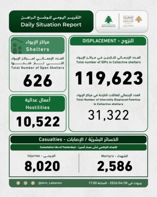وأشارت إلى أنّ "إجمالي عدد النّازحين المسجّلين في مراكز الإيواء ارتفع إلى 119,623 نازحًا، كما ارتفع العدد الإجمالي للعائلات النّازحة في مراكز الإيواء إلى 31,322. كما بلغ العدد التراكمي للشّهداء حتى مساء أمس 2586 والجرحى 8020، في حين ارتفع عدد الأعمال العدائيّة إلى 10522".